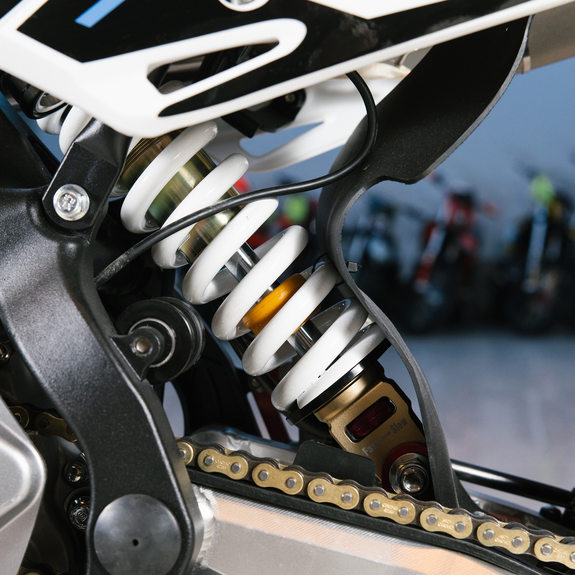 Передняя подвеска представлена телескопической вилкой перевернутого типа Fastace длиной 800 мм с возможностью регулировки отбоя и сжатия. Задняя подвеска оснащена моноамортизатором DNM DHL 360 с настройками отбоя, сжатия и скорости отбоя. Алюминиевый маятник с усиленной 15 мм осью выдерживает экстремальные нагрузки. Колеса оснащены ободами из сверхпрочного алюминиевого сплава 7116, ступицами CNC, усиленными подшипниками и спицами. Размер колес составляет 17/14, а резина с агрессивным протектором обеспечивает уверенное движение по пересеченной местности.